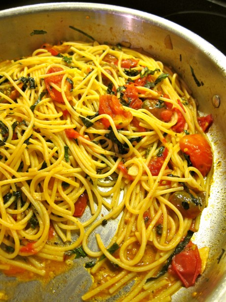 Add the pomodorini and taste for salt adding some in case you feel your sauce is bland. Cook for about 7 minutes and spaghetti is super al dente. Let cook for 2 or 3 minutes add basil and serve warm adding some raw extra virgin olive oil if you feel it can use it.
