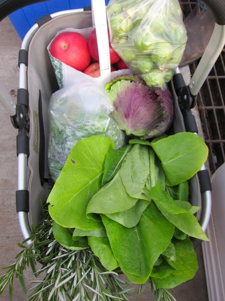 Coming home with us: Northern Spy apples, Brussels sprouts, Deadon cabbage, Komatsuna greens, rosemary, and mesclun mix.