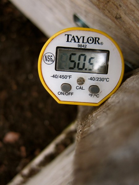 We’ve been waiting for the soil to warm up to 50°F — the minimum temperature at which we attempt to start seeds — before direct seeding the first Spring crop. Another  sign we watch for is when the dandelions show, a good indicator of soil rather than air temperature.