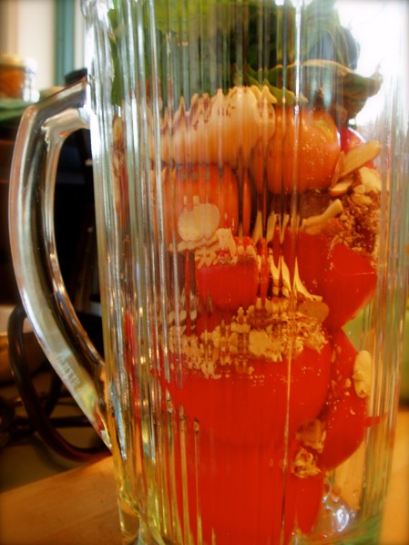 – Using a blender or food processor, add tomatoes, basil, garlic clove, almonds, chili flakes and salt. Blend for a minute or more, until finely pureed. Scrape down bowl and blend again if any large bits remain.