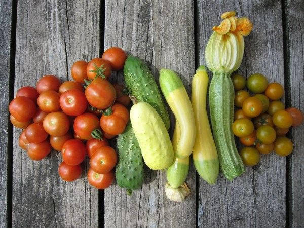 Coming on strong: cherry tomatoes, cucumbers, summer squash, green beans, eggplant