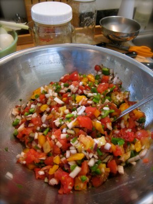 I make several jars of lacto-fermented salsa every year based on Sally Fallon’s Nourishing Traditions. This year’s batch is from a colorful mix of heirloom tomatoes fresh from the farmers’ market.