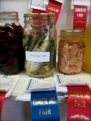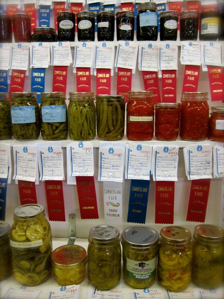 The last section of the Master Food Preserver Program was on judging canned goods at fairs, a fitting end to our training as one of the opportunities available to volunteer Master Food Preservers is fulfilling requests at different fairs. Each jar is judged against a standard, as set by The National Center for Home Food Preservation, and are often based on visual criteria alone, such as: type of container, uniformity, texture, pack, headspace, clarity/color, liquid to solids, and cleanliness. As it turns out, the Cumberland Fair was in full swing nearby, and I and a fellow student took a field trip there to see for ourselves what makes a blue ribbon winner.